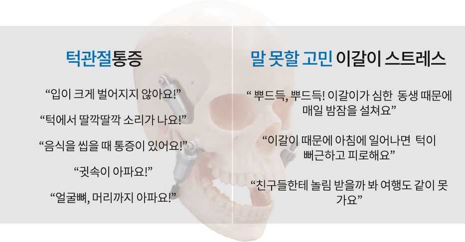 턱관절통증이나 이갈이는 치아와 교합의 문제로 발생하는 질환이므로