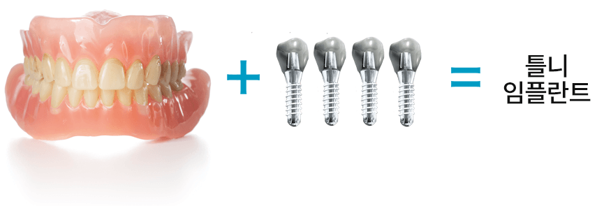 틀니임플란트는 4~8개 정도의 임플란트만 심고 그 위에 틀니를 올려서 고정하는 방법입니다.