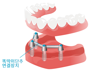 임플란트 부착부분이 틀니를 내면에서 잡아줘서 말 할때 잘 떨어지지 않고 음식을 잘 씹을 수 있게 됩니다.
